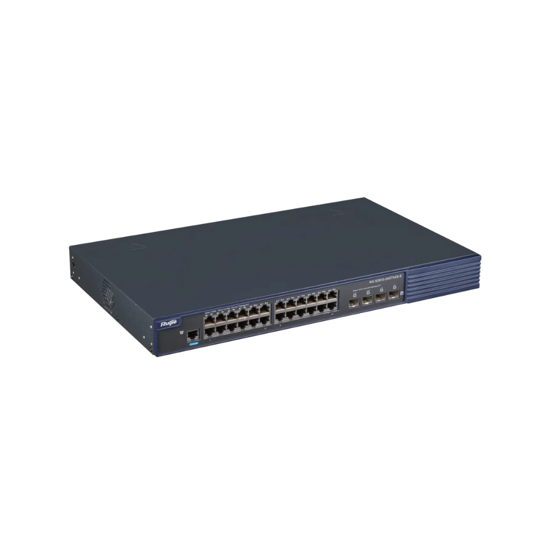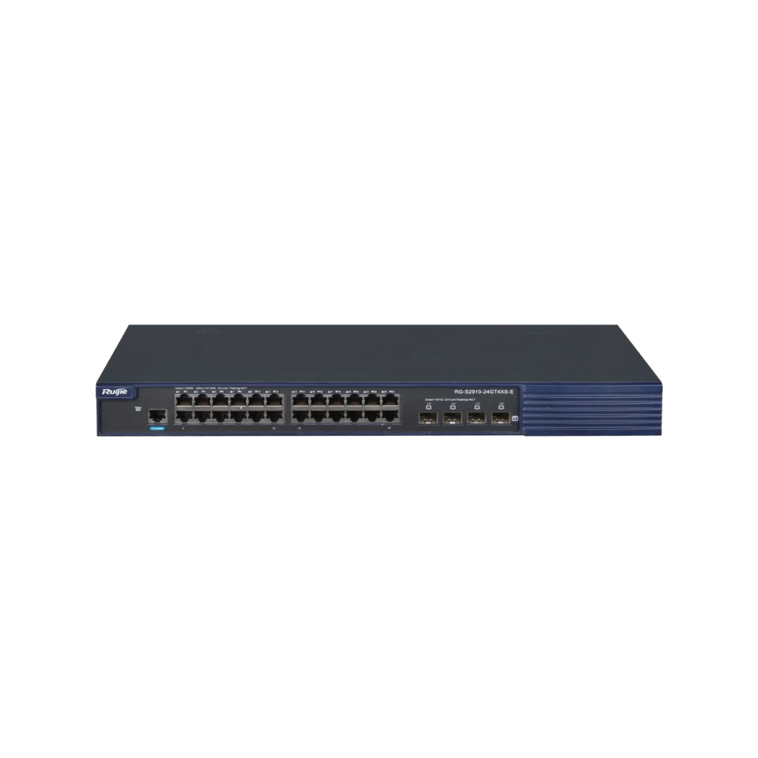 Ruijie RG-S2910-24GT4XS-E, kurumsal ağ ihtiyaçlarını karşılamak için tasarlanmış güçlü bir yönetilebilir switch modelidir. 24 Gigabit Ethernet portu ve 4 adet 10G uplink ile birlikte üstün performans, gelişmiş güvenlik ve kolay yönetim sunar.